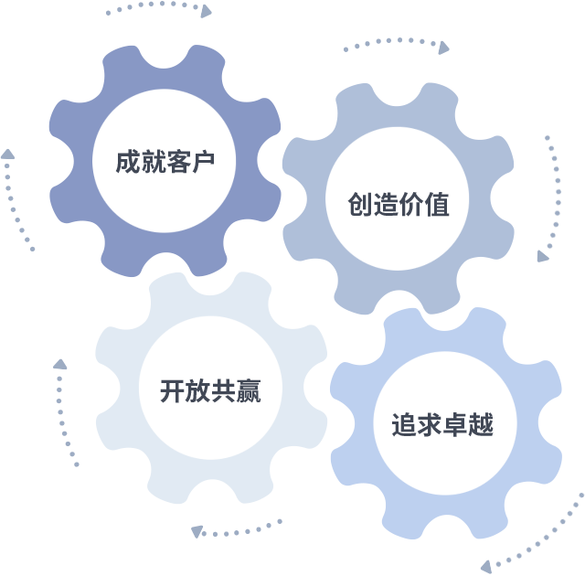 成就客户是一切决策的出发点,创造价值是衡量所有工作的标准,追求卓越是BWIN必赢做事做人的态度,开放共赢是BWIN必赢的格局也是最终的结果。价值观的齿轮环环相扣,推动着组织里的每个人不断向前。